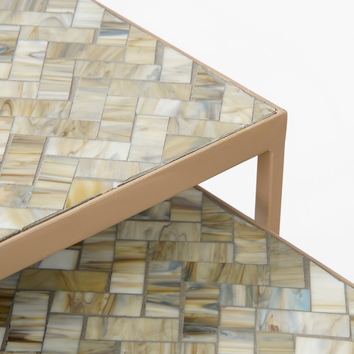 De Aaron bijzettafels zijn een stijlvolle toevoeging aan je interieur, tuin of balkon. Deze set van twee tafels combineert minimalistisch design met een luxe uitstraling. De taupekleurige metalen poten zijn per tafel verbonden, wat zorgt voor een speelse en moderne look. De tafelbladen, afgewerkt met verfijnde grijze tegelwerkjes van gekleurd glas, geven een artistiek accent aan elke ruimte. Dankzij het slimme ontwerp kunnen de tafels in elkaar geschoven worden, waardoor je eenvoudig ruimte bespaart.