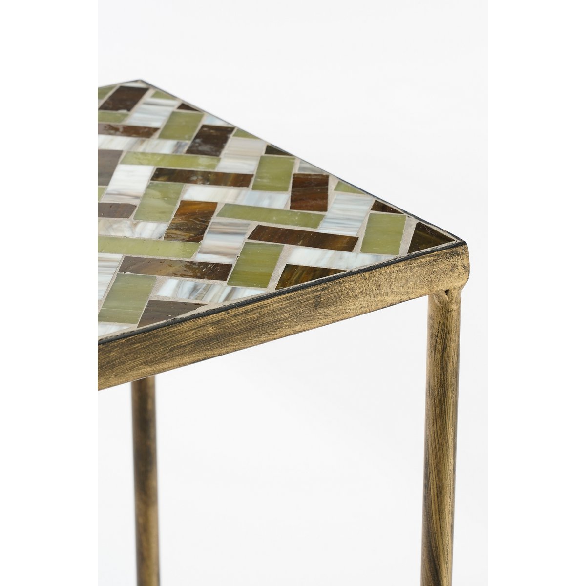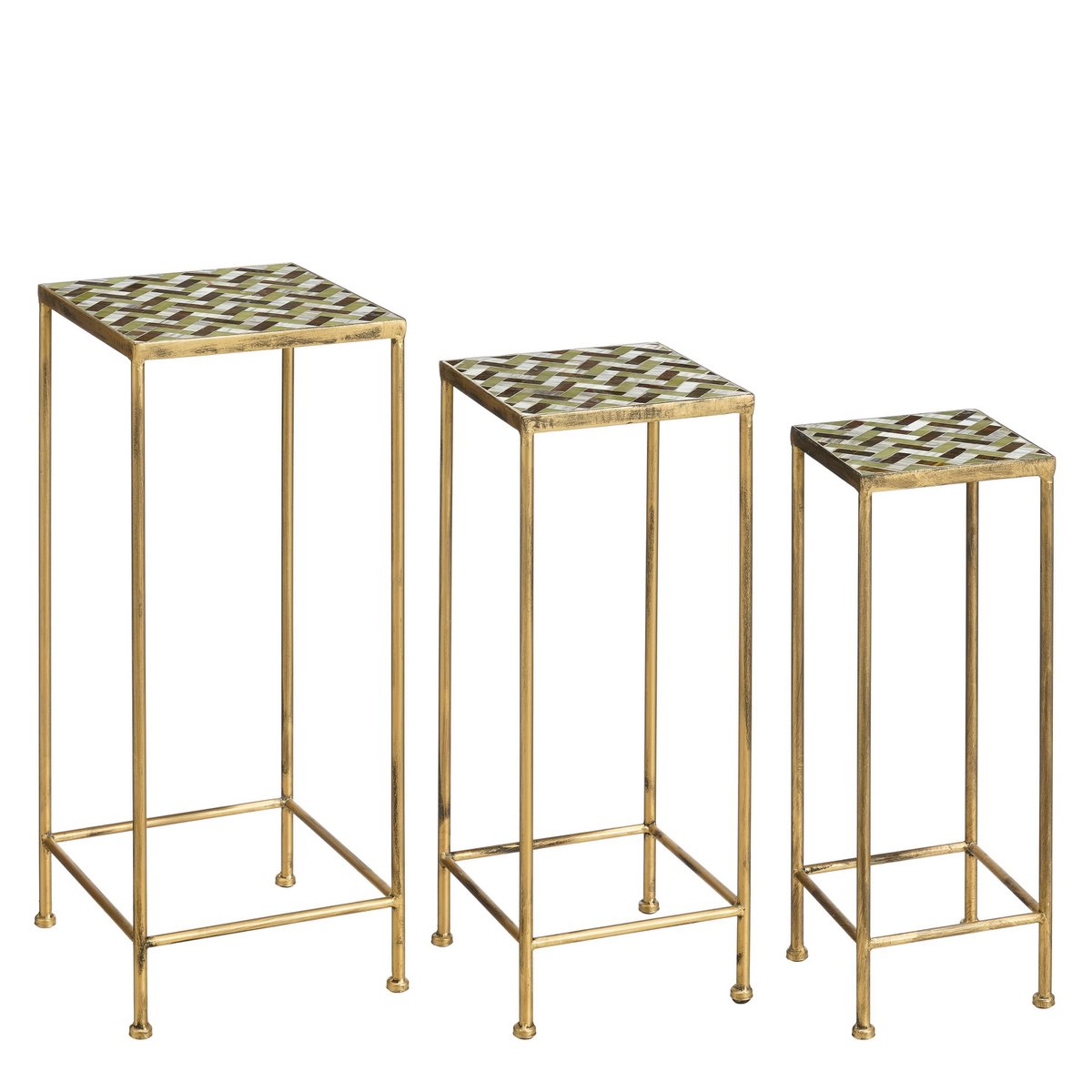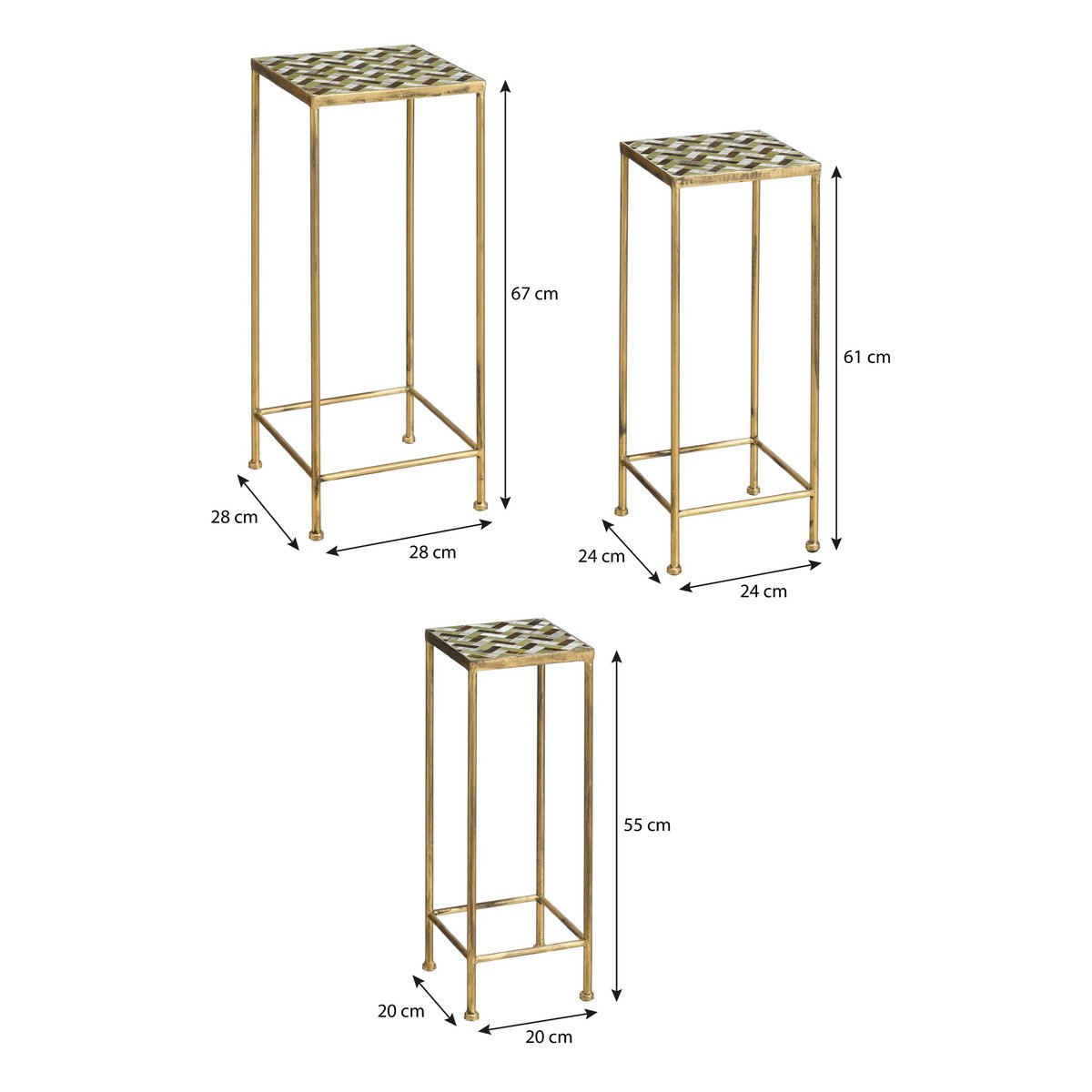 Of je nu geniet van een ontspannen koffiemoment of een gezellige borrel, de Alanza bijzettafel set zorgt voor een stijlvolle en functionele toevoeging aan je tuin, balkon of terras. Deze elegante tafeltjes zijn gemaakt van stevig, goudkleurig metaal en hebben een prachtig tafelblad met groene tegels, wat een luxe en Parijse uitstraling geeft. Dankzij het waterbestendige materiaal zijn ze bestand tegen alle weersomstandigheden en kunnen ze het hele jaar door buiten blijven staan.