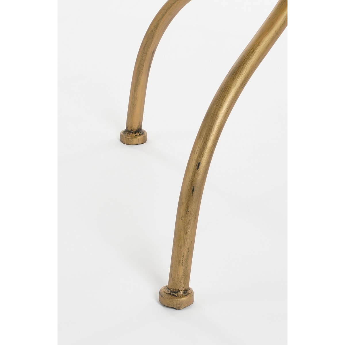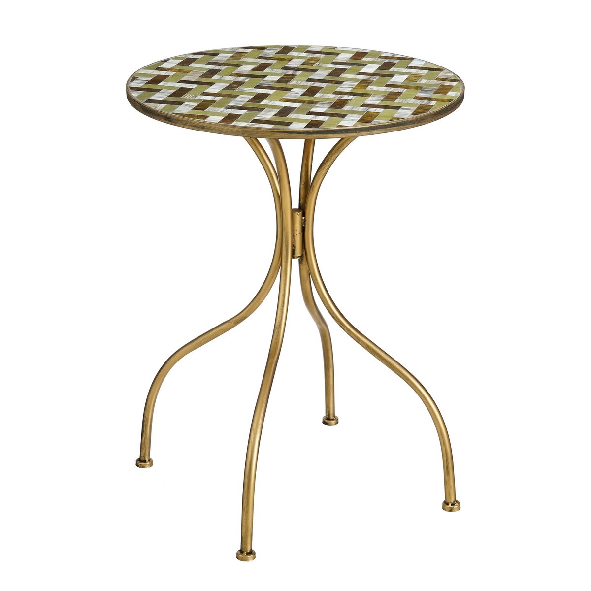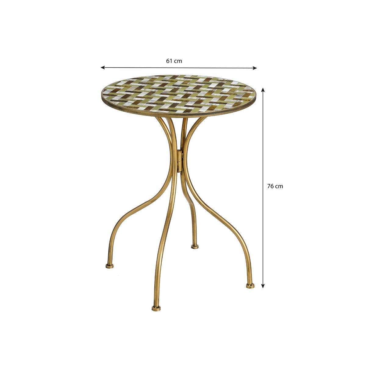 Breng een vleugje Franse charme naar je tuin, balkon of terras met de Alanza bistrotafel van Mica Decorations. Deze stijlvolle tuintafel is gemaakt van stevig goudkleurig metaal en heeft een prachtig tafelblad met groene tegels. Dankzij het weerbestendige materiaal kan hij gerust buiten blijven staan, ongeacht het seizoen.