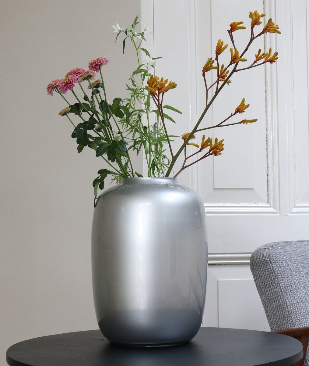 De Artic vaas in Zilver brengt een moderne luxe uitstraling in huis. Dankzij de glanzende zilverkleur en het strakke silhouet is deze vaas een echte eyecatcher, zonder schreeuwerig te zijn. De metallic finish geeft een verfijnd contrast aan neutrale interieurs, maar doet het ook perfect in combinatie met donkere of rijke kleuren.