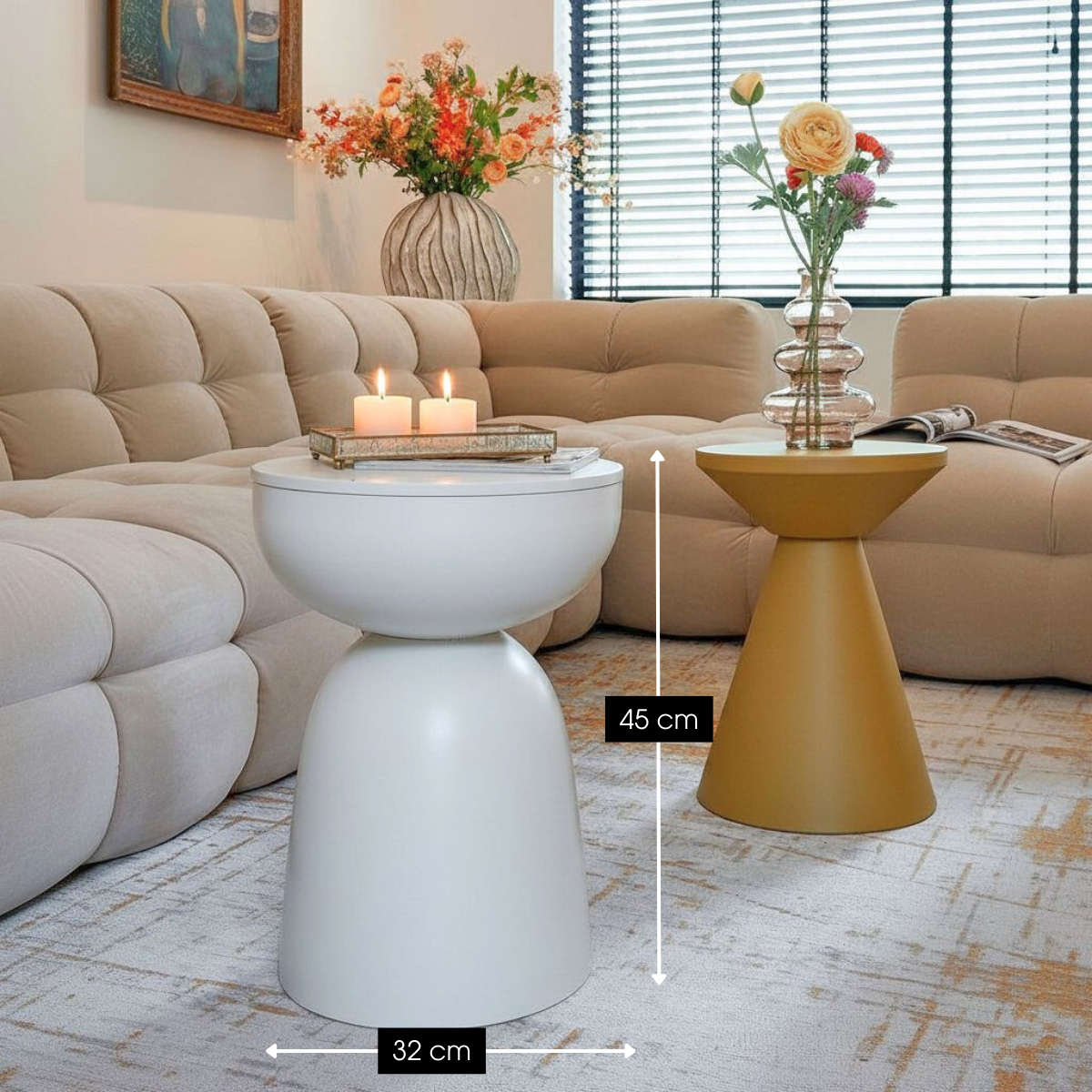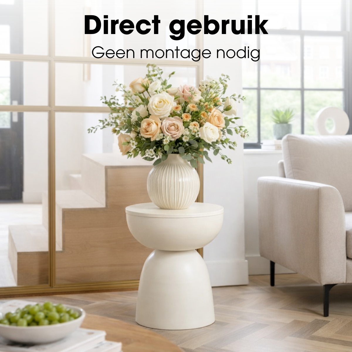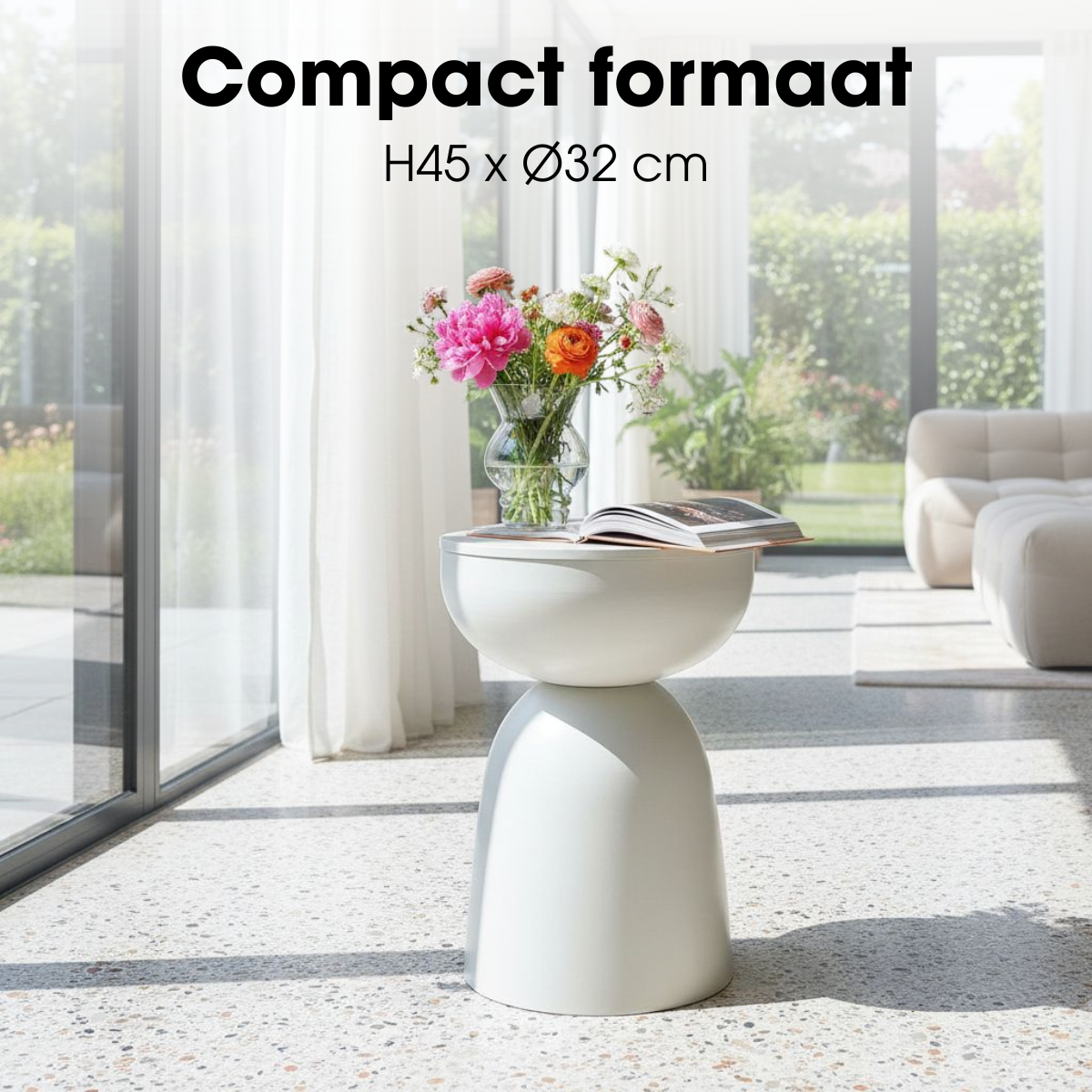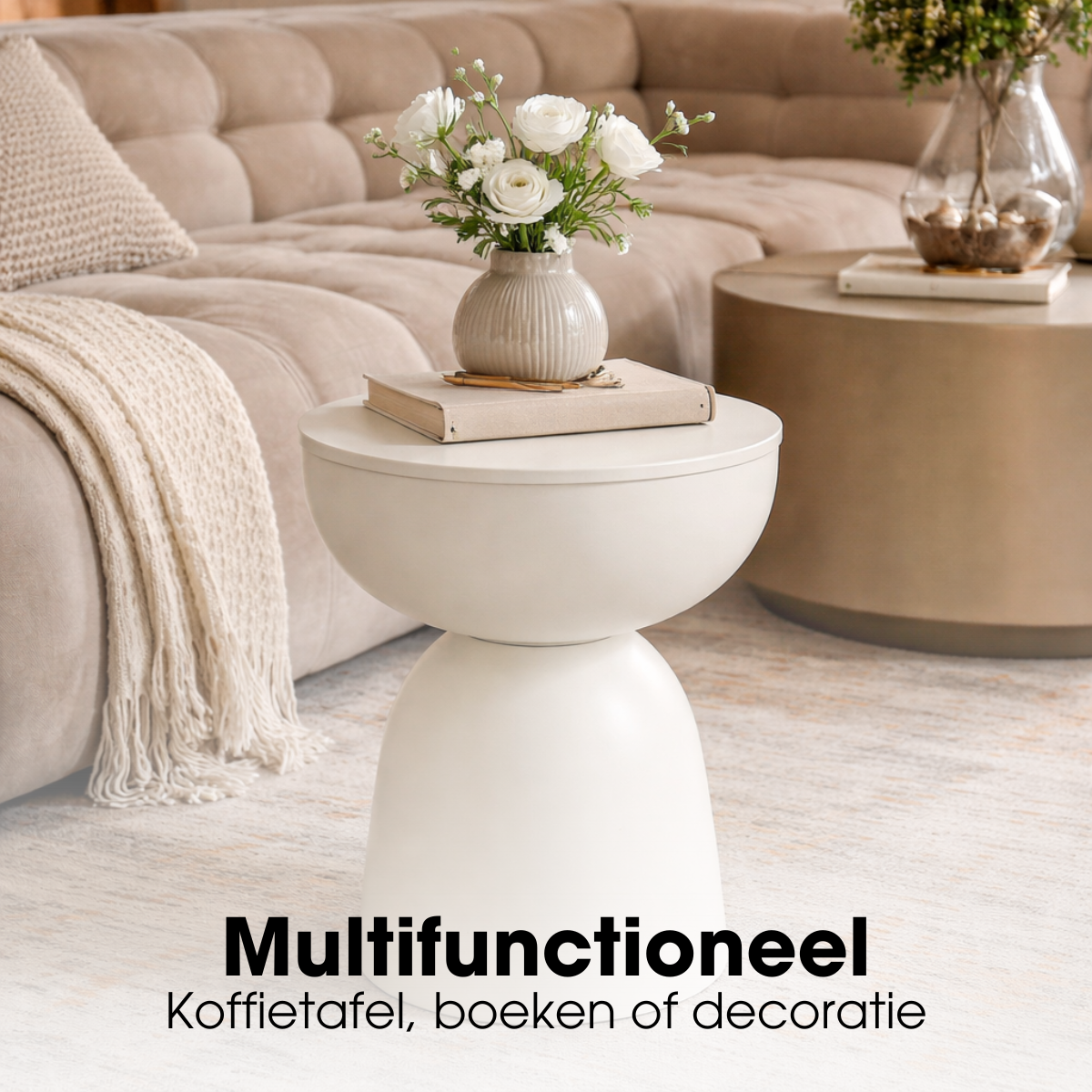 De Elliot bijzettafel in wit straalt eenvoud en frisheid uit. De lichte kleur en het ronde ontwerp zorgen voor een tijdloze uitstraling die moeiteloos past in moderne en minimalistische interieurs.