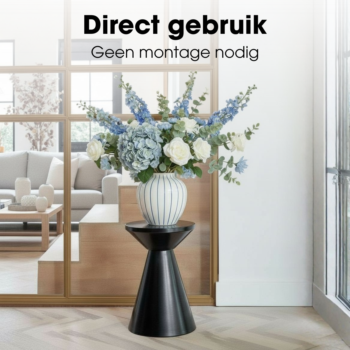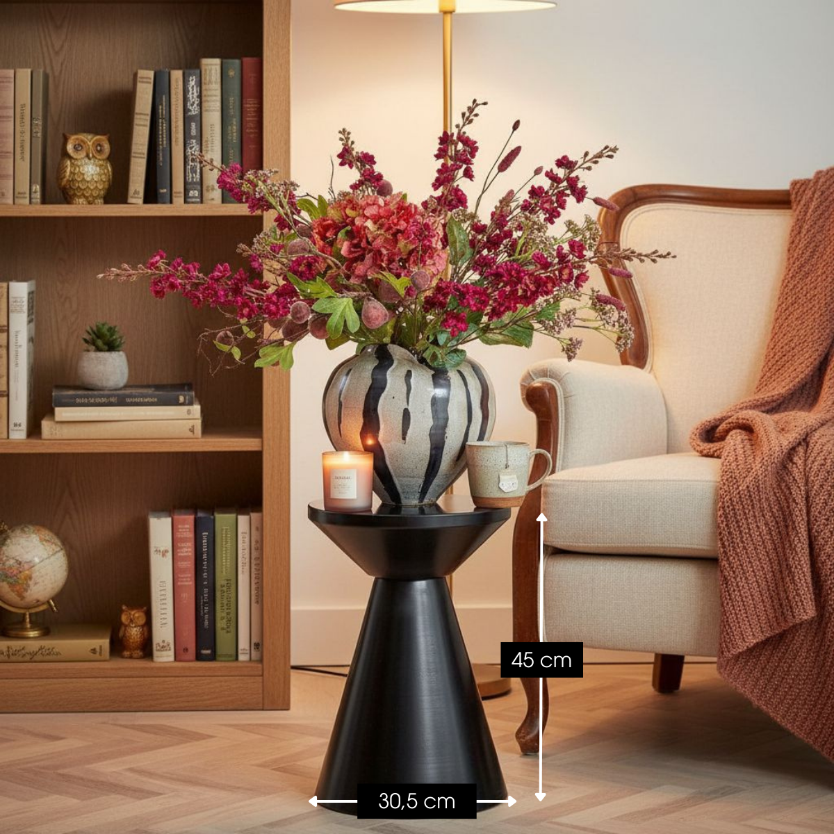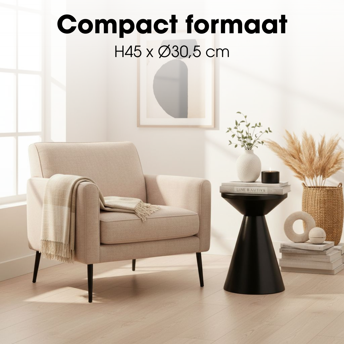 Met de Jim bijzettafel in zwart voeg je een krachtig en modern accent toe aan je woonruimte. De diepe zwarte kleur geeft de tafel een stoere, elegante uitstraling en past perfect in industriële en moderne interieurs.