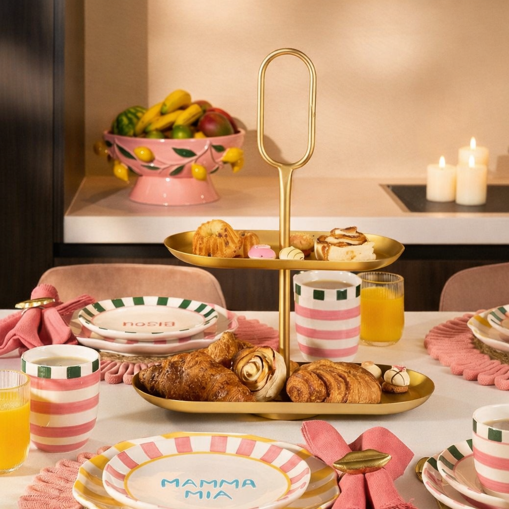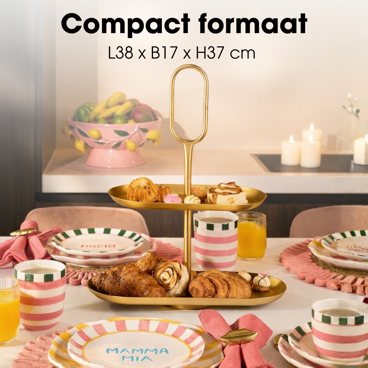 De etagère is gemaakt van stevig ijzer en biedt een stabiele, betrouwbare basis. Het compacte, rechthoekige ontwerp maakt hem ideaal voor zowel dagelijks gebruik als feestelijke gelegenheden. De Rama etagère is verkrijgbaar in zwart en goud, in ovaal en rechthoekig, en zowel in een 2-laagse als 3-laagse uitvoering, zodat je eenvoudig de variant kiest die past bij jouw tafelsetting of interieur.