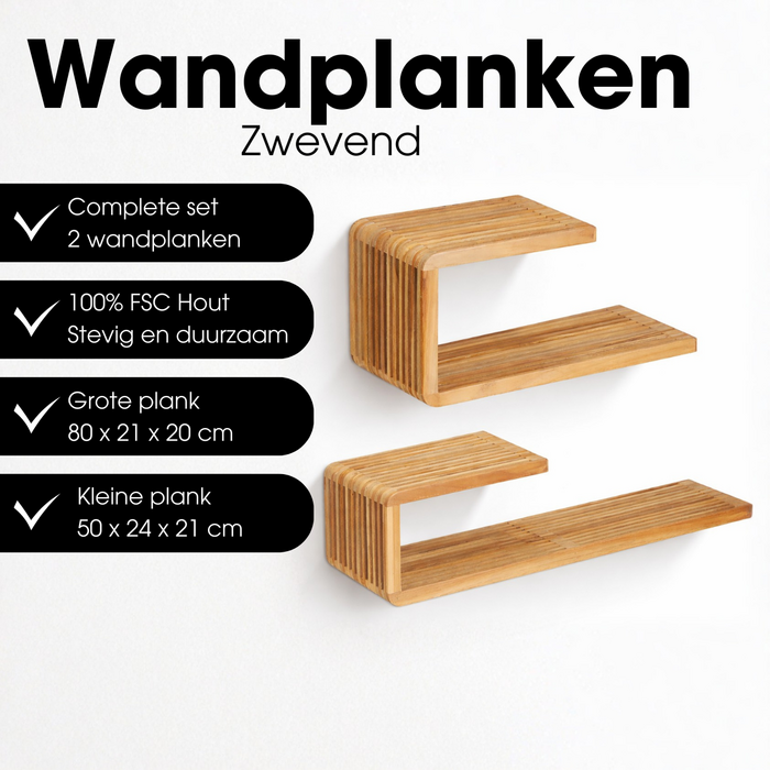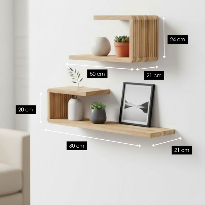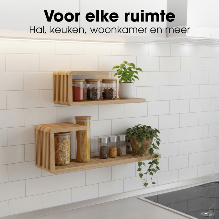 Deze set van twee zwevende wandplanken biedt eindeloze mogelijkheden in je interieur. Creëer een stijlvolle fotowand in de woonkamer, stal je favoriete boeken uit boven je bureau of geef decoratieve accessoires een mooie plek. Hang de planken asymmetrisch voor een speels effect of juist strak boven elkaar voor een rustige, gebalanceerde look.